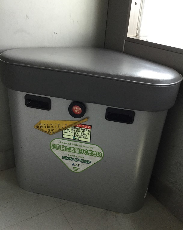 椅子付きもあります。この写真はまさしく23区の官公庁のものなので、備蓄してから数年たってそうな風格があります。だからか、椅子タイプは、椅子そのものだと思ってたという方が結構いらっしゃいます。黄色いシールに書かれてるけどはがれているからかも・・・。