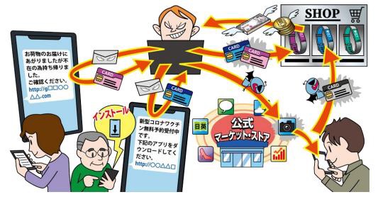 有名組織を装ったニセのSMS(ショートメッセージ)がスマートフォンに届き、SMSに記載されたURL(アドレス)にアクセスすると、不正アプリをインストールするよう誘導されます。