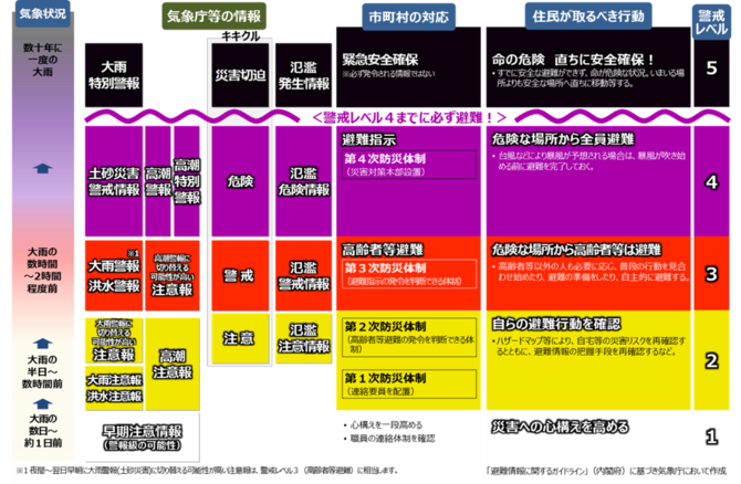 ちなみに、避難情報については、2021年5月20日、改正された災害対策基本法が施行され、市町村が発令する避難情報は、これまでの「避難勧告」と「避難指示」が一本化され、「避難指示」のみとなった。市町村は、警戒レベル情報の他、暴風や日没の時刻、堤防や樋門等の施設に関する情報なども参考に、総合的に避難指示等の発令を判断することになる。