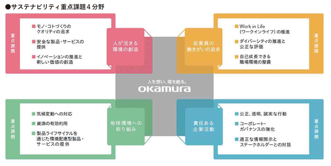 オフィス家具メーカーのオカムラ(神奈川県横浜市、中村雅行社長)は2021年からの中期経営計画にESGへの積極的な取り組みを掲げ、4つの重点課題を設定。うち「地球環境への取り組み」については、TCFDへの賛同を表明すると、その2カ月後に早くも情報を開示した。気候変動対応への高い目標、リスクと機会への取り組み意欲がサステナビリティ推進体制を前進させ、ESGをけん引している。
