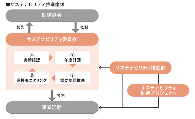 委員長は社長が務め、各事業本部とコーポレート部門を統括する執行役員が参加。事務局はサステナビリティ推進部が担当する。承認事項は各組織を介して事業に展開。定期的なフォローを行うとともに取締役会に報告し、取締役会の管理、監督を受ける。
