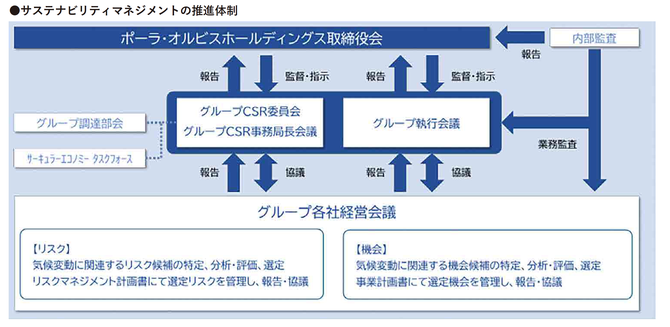 ポーラ・オルビスホールディングスのサステナビリティマネジメント体制は、TCFD開示に取り組むタイミングでさらに強化された。気候変動対策の執行機関となるグループCSR委員会が、サステナビリティの方針を策定。グループ各社はその決定を事業計画に反映させる。