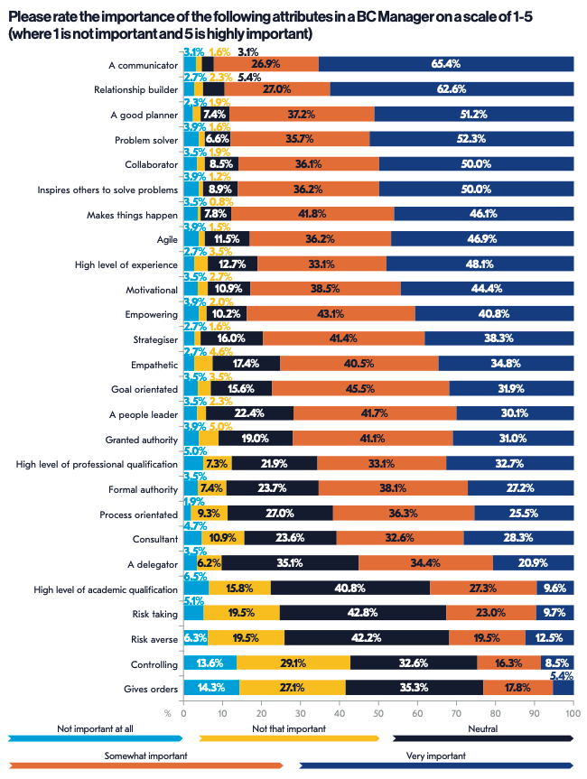 図1は、「事業継続マネジャーにとって以下の特性がどのくらい重要か?」という設問に対する回答結果である。左側から順に「全く重要でない」(水色)、「あまり重要でない」(黄)、「中立」(紺)、「それなりに重要」(オレンジ)、「とても重要」(青)という回答の割合を表しており、「とても重要」と「それなりに重要」との合計が大きい順に並べられている。