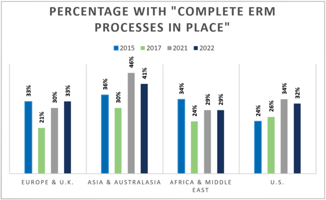 図1は、自社で「完全なERMのプロセスが整っている」と回答した人の割合を、地域別に示したものである。多少のバラツキはあるものの、回答者の半分以上は、自社のERMが何らかの形で不完全、もしくは満足できる状況ではないと認識していることが分かる。