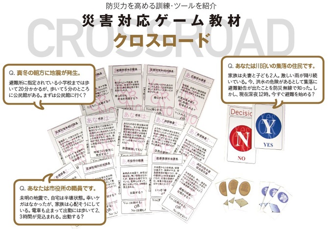 クロスロードは、阪神・淡路大震災で災害対応にあたった神戸市職員へのインタビューをもとに、実際に震災で問題となったさまざまな「災害対応のジレンマ」の事例などをカードゲーム化したもの。矢守克也氏(京都大学防災研究所教授)、吉川肇子氏(慶應義塾大学教授)、網代剛氏(ゲームデザイナー)によって開発された。「クロスロード」は「分岐点(岐路)」の意味。現在では、「市民編」「災害ボランティア編」などさまざまなバリエーションがある。