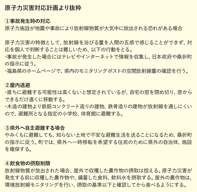 また、福島県特有の災害として、地区防災計画の中には「原子力災害」を盛り込んだ。原発から65キロメートル離れているために直ちに避難しなくてはいけないわけではないが、東日本大震災を踏まえ、以下の指示を記載している。