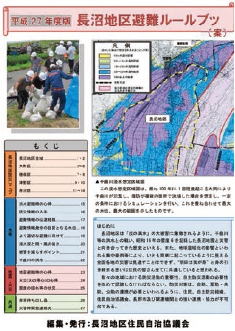 地区防災計画の策定にあたっては、まず、住民自治協議会や自主防災会の役員、住民自治協議会の構成地区である大町、津野、穂保、赤沼の各区の役員、さらには消防団や、民生児童委員の役員、市の危機管理防災課担当、防災アドバイザーら約30人を集めて「地区防災計画策定委員会」を設置。それまで住民自治協議会らが中心となり策定を進めてきた「避難ルールブック」や「地区防災マップ」の内容を見直すとともに、災害時の協議会としての活動を「長沼地区防災計画」にまとめる作業を開始した。このうち、避難ルールブックと地区防災計画については全戸に配布することを前提に、住民が避難する際に実際に役立つものを作ることを方針として決めた。