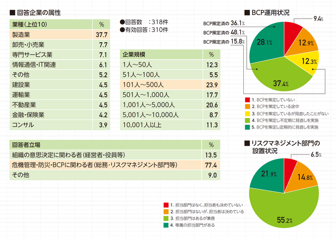 また、リスクマネジメントやBCP、防災部門の設置状況は、全体の55.2%が兼務での担当部門を持ち、次いで専属での担当部門があるが21.9%だった。これらのことから、リスクマネジメントやBCPにかなり力を入れている企業が本アンケート調査に回答している。
