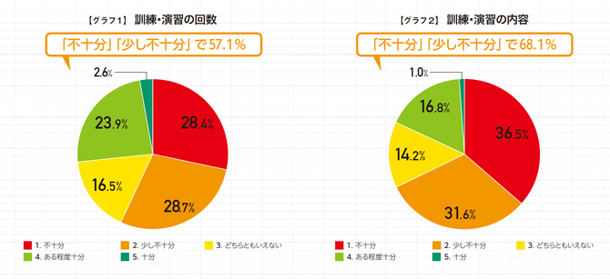 アンケートでは、現在自社で行っている訓練・演習の頻度や内容について、どの程度十分と感じているかを「1.不十分」から「5.十分」までの5段階で尋ねた。