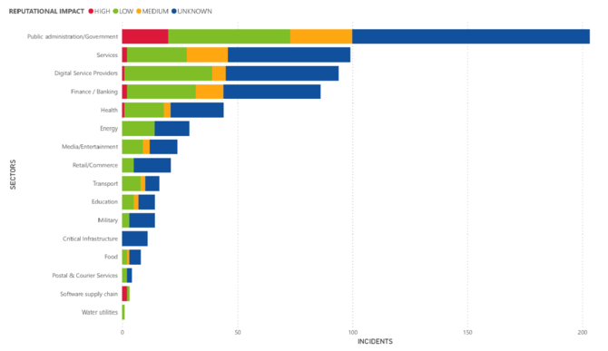 図1は、調査対象期間内に発生したセキュリティインシデントの件数を業種ごとにまとめたグラフである。バーはレピュテーションに対する影響の大きさによって色分けされており、左側から順に「高い」(赤)、「低い」(緑)、「中程度」(黄)、「不明」(青)となっている。公的機関や政府(Public administration/Government)においては、インシデントの件数自体が最も多いが、レピュテーションに対する影響が高かったインシデントの割合も高かったことが示されている。