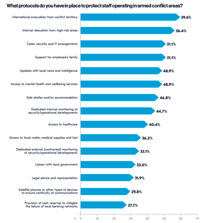 図1は武力紛争が発生している地域の従業員を守るために、どのような手順(protocols)を準備しているかを尋ねた結果で、回答の多いものから順に国外退避、(国内での)よりリスクの低い地域への移動、サイバーセキュリティやITに関する対策、従業員の家族へのサポート、などとなっている。