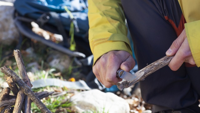 そのとき、ふと彼はポーチに登山ナイフが入っているのを思い出しました。「これだ…」。彼はあわただしく近くの灌木から手頃な太さの真っ直ぐな枝を折り、2本に分け、登山ナイフで節の部分を削り取りました。