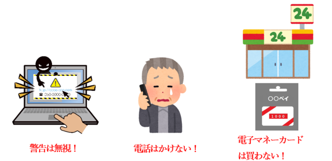 サポート料と称し、有料のサポート契約やアプリを購入させられたり、支払いに電子マネーカード等をコンビニで購入するように要求され、番号等の情報を盗まれたりします。