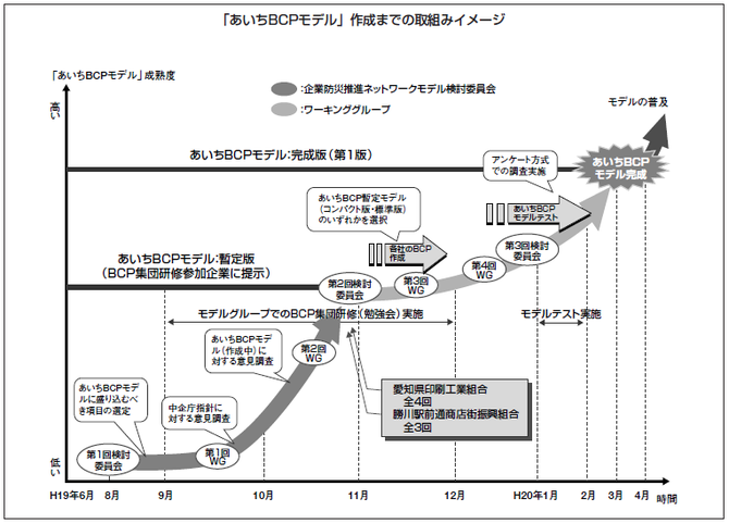 同モデルは、「企業防災推進ネットワークモデル事業」として取り組み、プラン策定や検討委員会の運営、普及啓発業務などを損保ジャパン・リスクマネジメント(東京都)に委託した。その間、3回の検討委員会、4回のワーキンググループ、モデルグループによる集団研修などを経て完成した。