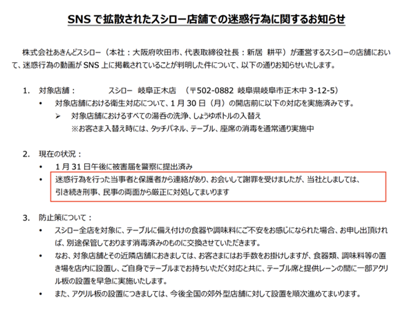 そんな消費者心理を考慮してか、社会問題となった今回の事件に対して、スシローは「刑事・民事の両面から厳正に対処する」と発表しています。同じような迷惑行為がつづかないためにも、大切な方針決定だと考えます。