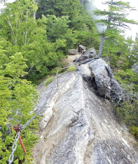 笹の平から刃渡りの露岩帯を注意深く通過し、五合目へ。そこを過ぎると俄然、体力がものをいう厳しい登りになります。垂直に近い岩の裂け目に張り巡らされたはしごやロープ、鎖を頼りに腕力と足力と気力でガンガンよじ登ります。