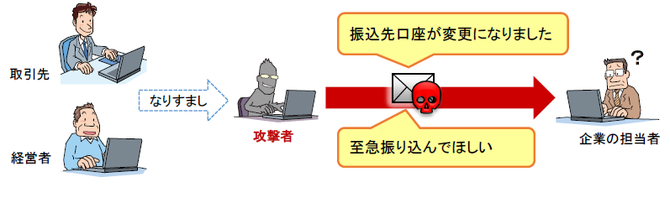 取引先等と請求に係るやりとりをメールなどで行っている際に、攻撃者が取引先になりすまし、「振込先口座が変更になりました」「至急振り込んでほしい」などのメールを送り付け、偽の請求書等により攻撃者の用意した口座へ振り込みをさせる手口です。