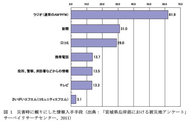 図1は、東日本大震災における災害情報入手チャネルの調査結果の一つである。宮城県内では 6割を超える人が「ラジオを頼りにして」いた。平時から地域社会との絆があるからこそ頼りにされる。その背景の一端をうかがわせる事例である。