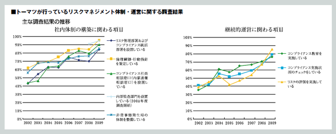 ERMへの取り組みはすでに多くの大企業で行われている。トーマツでは、同社が開催するセミナー出席者らに対してリスクマネジメント体制の構築や運営についてアンケート調査を行っているが、2009年調査では、体制構築および運営の双方の項目の平均が80%を超え(下図表)、リスクマネジメントのすそ野が着実に広がっていることを裏付けた。「弊社主催のセミナー参加者ということで母集団のレベルが若干高いとは思いますが、調査を開始した2002年当時は40%程度だったことを考えると、かなり取り組みは進んでいると言えます」(達脇氏)。