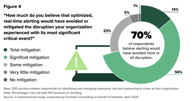 そのような問題意識に基づく調査項目のひとつが図1である。これは回答者が直近の12カ月間に経験した最も深刻な事象(most significant cirtical event)に関して、もし最適化されたリアルタイムの警報システムがあったとしたら、悪影響をどのくらい軽減または防止できたと思うかを尋ねた結果である。回答者の7割が、そのような警報システムがあれば悪影響を完全に、もしくは大幅に軽減できただろうと回答している。