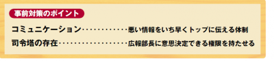 もう1つ大切なのが危機発生時に意思決定をする司令塔の存在。特に、マスコミなど外部への対応については普段からマスコミと付き合いのある広報部長がすべてを取り仕切るべきだとする。そのためには広報部長を役員に選任するなど権限と責任を持たせるべきだと三隅氏は語る。「経営者の分身として、社内の統制が取れるような人材でなければ務まらない」。