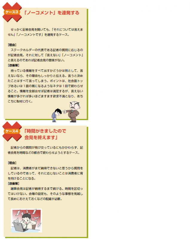しかし、三隅氏は、これらをしっかり伝えたとしても、非難されるケースは多々ありえると指摘する。以下、三隅氏が挙げる「記者会見の悪い例」をまとめた。