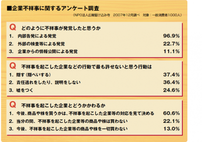 NPO法人広報駆け込み寺が一般消費者1000人を対象に行った企業不祥事に関する調査がある(2007年12月調べ)。