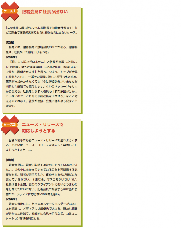 最も重要なのがコミュニケーション。社外とのコミュニケーションはもちろんだが、そもそも、社内において悪い情報を一早くトップに伝えるためのコミュニケーションが不足しているとする。「担当者や担当部署は、怒られることを怖がってミスを隠し込む。結果、社内ならミスとして処理されるような問題が、隠しておくことで内部告発などによってマスコミなど外部に伝わり、不祥事になってしまう」。日ごろから組織中で風通しをよくし、十分にコミュニケーションを図っておくことが何より重要ということだ。