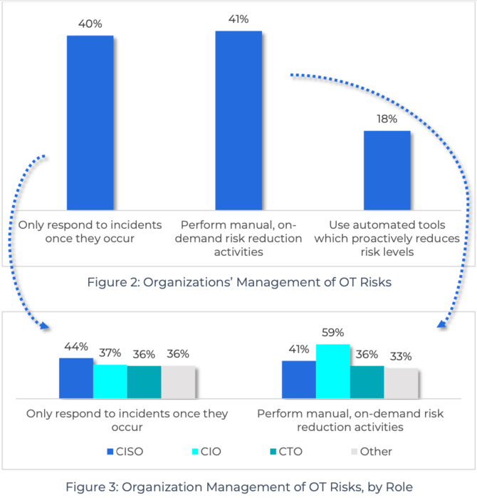 図1はOTに関するリスクへの対策状況を尋ねた結果である。まず上側(Figure 2)では、「発生したインシデントのみに対応する」(左側)と「手作業で、必要に応じてリスク軽減のための活動を行う」(中央)がそれぞれ4割程度を占めており、「能動的にリスクレベルを下げるための自動化ツールを用いている」(右側)は2割弱しかないことが示されている。さらに下側(Figure 3)には、その内訳が回答者の役職ごとに示されている。