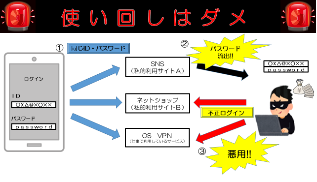 同じIDとパスワードの組み合わせを使い回していると、利用しているサービスのシステムがサイバー攻撃の被害に遭って、IDとパスワードが流出した場合、他のネットショップや利用しているOS、VPN機器などにも不正ログインされ、金銭的な被害や情報流出が発生するおそれがあります。
