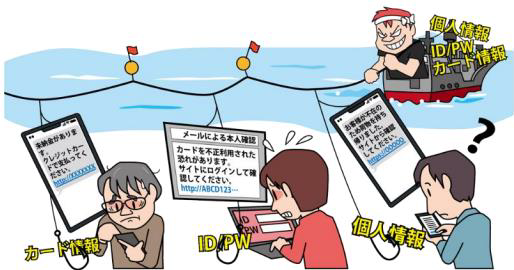 公的機関や金融機関、ショッピングサイト、宅配業者等の有名企業を騙るメールやSMS(ショートメッセージサービス)を送信して、正規のウェブサイトを模倣したフィッシングサイト(偽のウェブサイト)へ誘導し、IDやパスワードなどの認証情報や個人情報などを入力させ詐取する手口です。