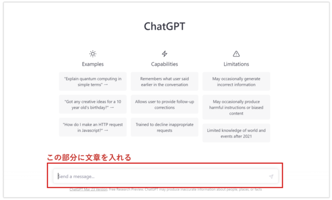 ChatGPTは、基本的に誰でも使うことができます。有料プランでは、より高度な言語モデルを利用できたり、回答にかかる時間が短縮されたりというメリットもありますが、まず試しに使ってみたい場合は無料プランで十分です。 始めるには、まずChatGPTのホームページに行きます。そして、「Try ChatGPT」からサービスに入り、「Sign up」からアカウントを作るだけです。そして、下記メイン画面の「Send a message…」という部分に文章を打ち込んでみましょう。