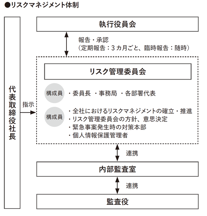 毎月開催しているリスク管理委員会の構成員は、経営企画本部やシステム本部、ロジスティクス部、法務部門、広報部門などの部長ら。同委員会専任の事務局員2名を含めた15名が参加する。