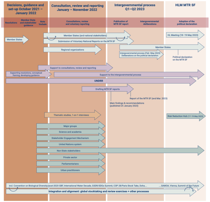 なお図の右上にある「HLM MTR SF」というのは「High-level Midterm review of the implementation of the Sendai Framework 2015–2030」の略であり、仙台防災枠組に関する意思決定を担う上層部による中間レビューを指す。図の右上の方には、2023年5月に上層部によって行われる会議(HL Meeting)において何らかの意思決定や宣言(declaration)が行われる予定が示されており、本報告書はその会議に対するインプットのひとつとなっていることが分かる。