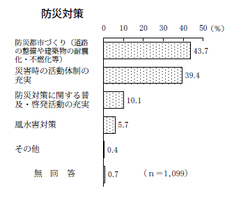防災対策への具体的な要望事項は、防災都市づくり(道路の整備や建築物の耐震化、不燃化等)が43.7%と最も高く、次いで災害時の活動体制の充実が39.4%、防災対策に関する普及・啓発活動の充実が10.1%と続く。