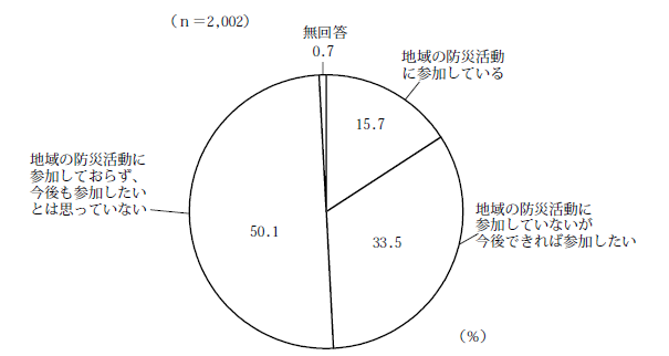 このほか、地域の防災活動への参加状況について聞いたところ、「地域の防災活動に参加している」は16%で、「参加していないが今後できれば参加したい」が34%、「参加しておらず、今後も参加したいとは思っていない」は50%を占めた。