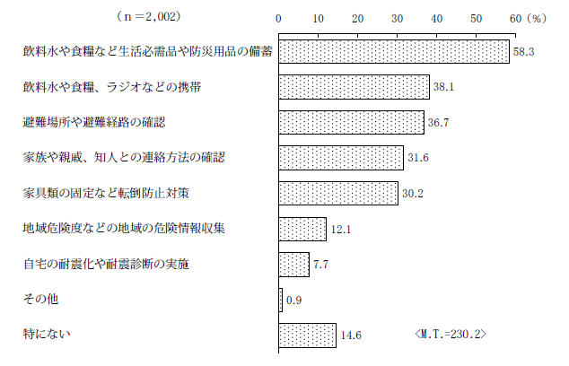 また、都が今年4月に公表した首都直下地震等による被害想定を受け、都民として備えを強化したものを聞いたところ、「飲食や食糧など生活必需品や防災用品の備蓄」が58%でトップ、「飲料水や食糧、ラジオなどの携帯」が38%、「避難場所や避難経路の確認」が37%、「家族や親戚、知人との連絡方法の確認」が32%と上位を占めた。一方で、自宅の耐震化や耐震診断の実施は7.7%と1割にも満たない。