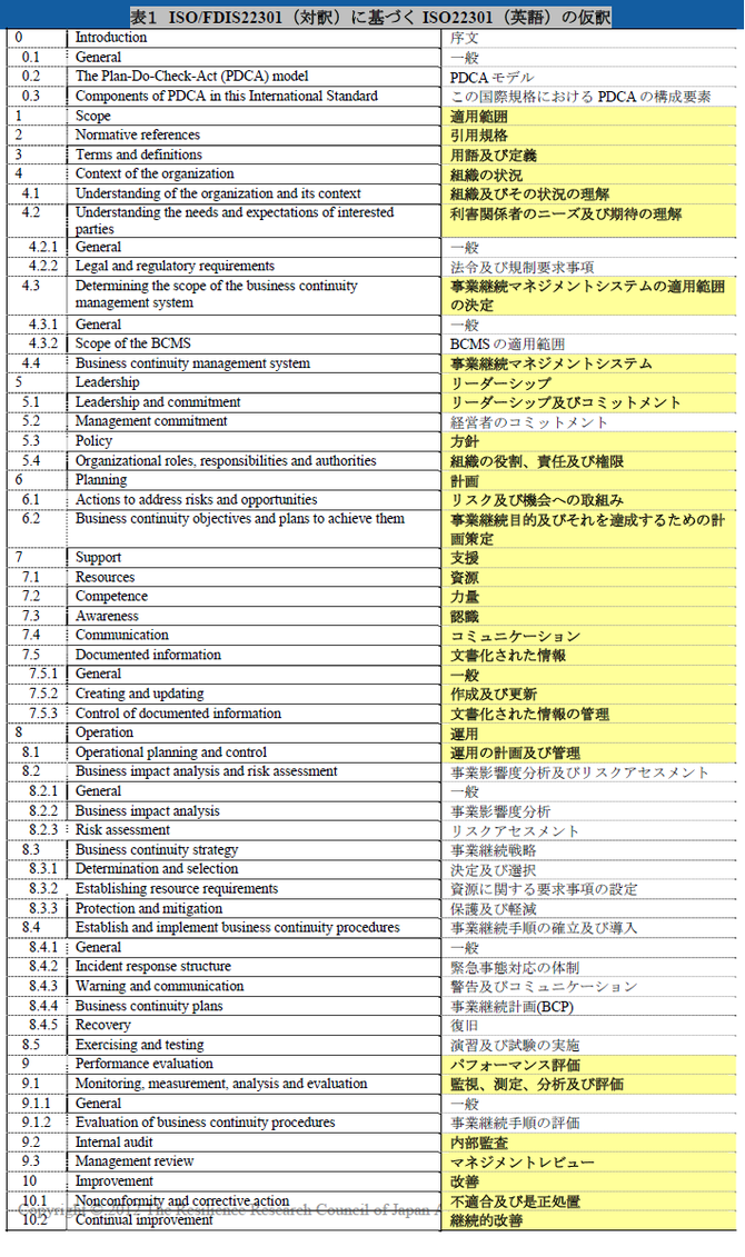 参考までに、現在、発行されているISO22301(英語)とISO/FDIS22301(対訳)からISO22301(英語)を日本語にしたものを表1に記述する。