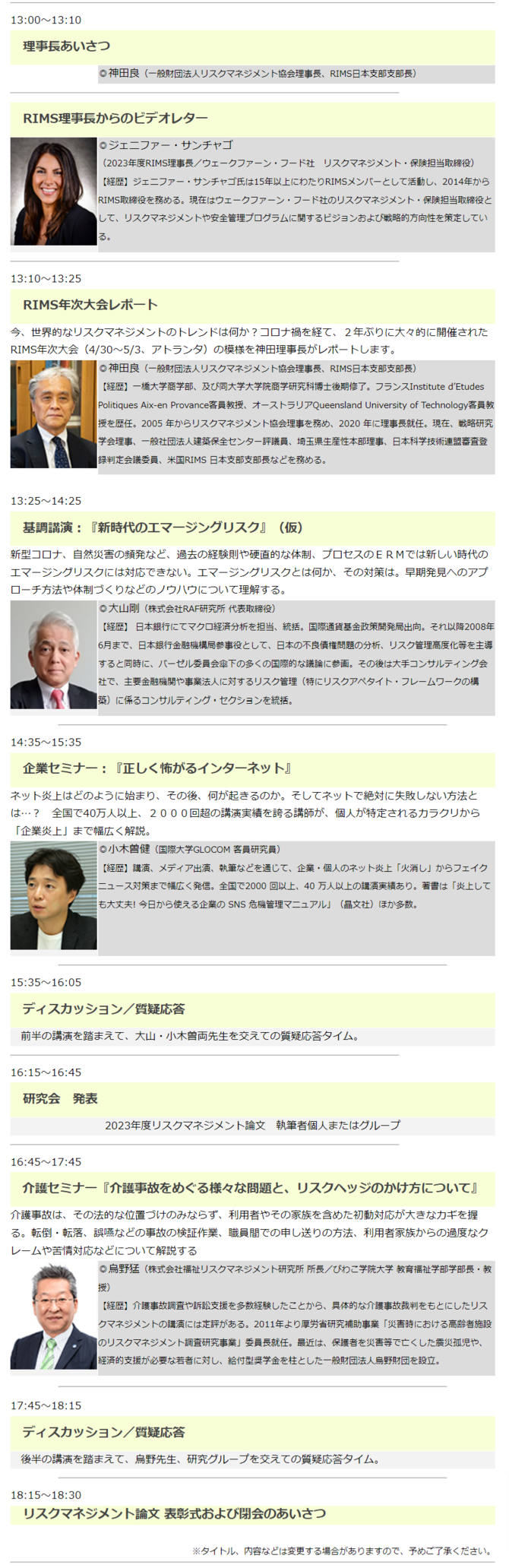 当日は、RIMS理事長のジェニファー・サンチャゴ氏(ウェークファーン・フード社 リスクマネジメント・保険担当取締役)のビデオメッセージを投影するほか、2年ぶりに開催されたRIMS年次大会(4/30~5/3、アトランタ)の模様を同協会理事長の神田良氏がレポートする。さらに、新型コロナ、自然災害の頻発など、新しい時代のエマージングリスクにへの対応について、株式会社RAF研究所代表取締役の大山剛氏が講演する。