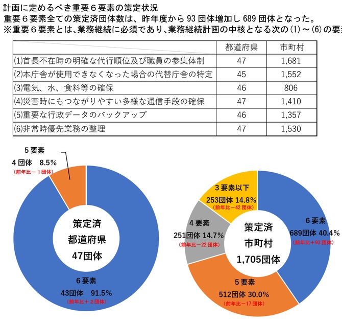 それによると、市町村における業務継続計画の策定済団体数は、昨年度から 12 団体増加し 1705 団体となった(策定率 97.9%)。また、重要6要素全ての策定済団体数は、昨年度から 93 団体増加し 689 団体となったものの、策定率は40.4%にとどまり、同庁では災害時の業務継続性の確保の観点から、重要6要素を盛り込むなど計画内容の一層の充実が求められるとしている。