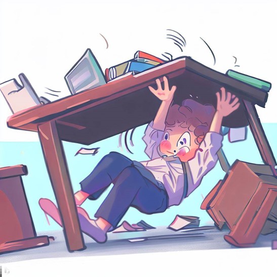 そこで、Bing イメージクリエーターに「地震の揺れが大きくて、机の脚を押さえていても飛ばされる」ということを入力して描いてもらったのが上のイラストです。