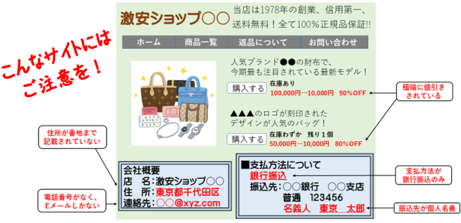インスタグラムなどのSNSやインターネット上の安売り広告、検索エンジンの検索結果などから誘導されたサイトで購入した商品が届かないといったトラブルが発生しています。 最近では、人気インテリア雑貨等の公式通信販売の正規サイトを装った「偽ショッピングサイト」での被害が発生しており、特に極端に安いネットショップは要注意です。