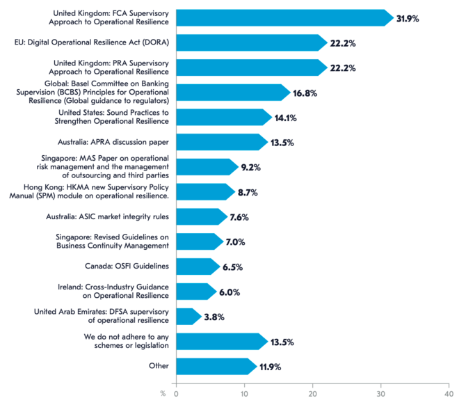 図1は、回答者の組織がどのような法律や監督指針などに従うかを尋ねた結果である。アンケート調査の回答者のうち38.2%を欧州、19.9%を北米、13.3%をオーストラリアおよびニュージーランドなどが占めているので、これらの国々に関する法律や監督指針などに対する回答が多くなるのは当然の結果と言えるが、2022年版と比べて違いが目立つのは、EUのDigital Operational Resilience Act (DORA) が前回の4位(6.6%)から大幅にランクアップしていることである。実は欧州からのアンケート回答者の割合は10ポイント近く減少しているので、欧州からの回答者が減ったにもかかわらず、EUの法律の存在感が高まっているということになる。