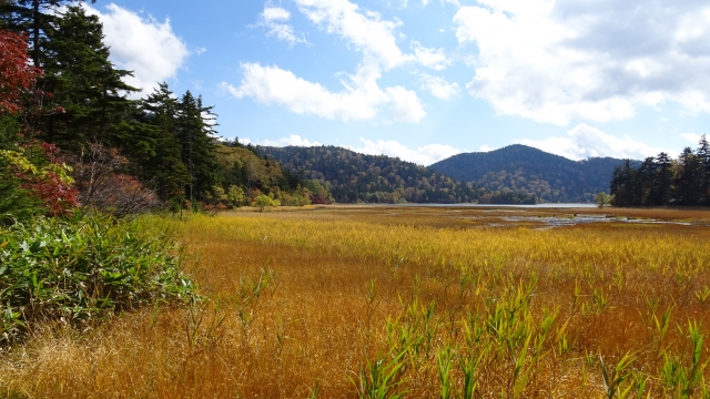 尾瀬ヶ原はすでに晩秋の気配が漂っています。広大な山吹色の原っぱの所々には池塘が広がり、透き通った快晴の空の青さを映し出しています。凛とした空気とノスタルジックな雰囲気、そして木道の真ん中に一人佇んで晩秋の湿原を眺めている自分。ハルトはこの孤独感が嫌いではありません。