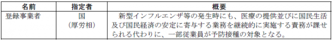 ▶そこで、特措法では、住民を対象とした予防接種の実施に先立って、一部の事業者を「登録事業者」として指定し、ワクチンの優先接種の対象とすると定めている。