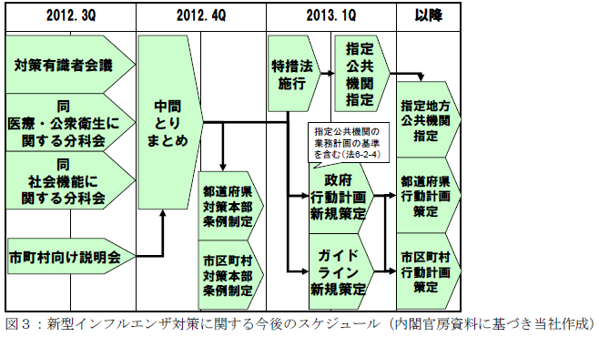 これまでみてきたように、日本国内では、流行も収束し、社会の関心も相当沈静化した高病原性鳥インフルエンザではあるが、世界的には流行が継続しており、特に日本企業の進出が著しい中国やベトナムなどアジア諸国では、ヒトの発症例もあとを絶たず、依然として高い致死率を記録している。これがいつヒトインフルエンザに変異するかは予断を許さない状況にあるとの判断に基づいて、日本政府は、新型インフルエンザ対策の見直しを進めている。2012年5月の特措法制定はその一環である。