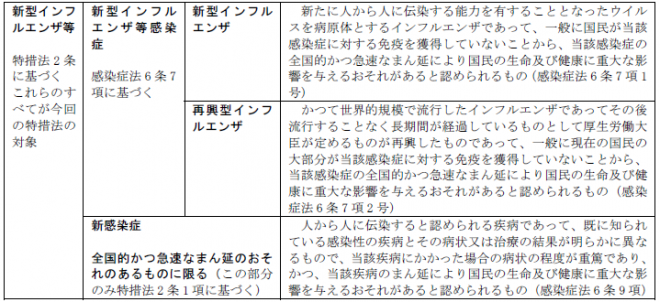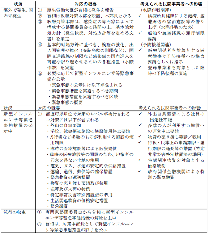 2012年5月11日、公布されたこの法律は、2009年の新型インフルエンザ対策において明らかになった問題点を法制面から改善することを目的として、対策本部の体制、対策検討に当たっての専門家の関与、予防接種の実施、水際対策等について定めたものである。制定にあたっては、外出自粛や興行場・催し物等の制限の要請、検疫のための病院・宿泊施設等の強制使用など、かなり強い強制力や拘束力を持つ内容も含まれるため、日本弁護士連合会が慎重な対応を求める会長声明を発表するなど、物議をかもした。この法律を企業の観点から見ると主なポイントは以下のとおりである。