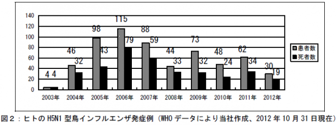 このような事情を考慮すると、今後の新型インフルエンザ対策を検討するに当たっては、動物間での流行状況、特にヒトに感染した場合に重篤な症状を起こす高病原性鳥インフルエンザウイルスの流行状況を把握しておくことが重要である。