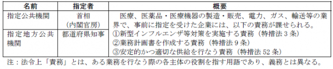 ▶ 国又は地方自治体は、病原性が高い新型インフルエンザなどの流行下でも国民生活と経済活動の根幹を支えるために欠かせない事業者を指定(地方)公共機関として指定する。この仕組みの概要は以下のとおりである。