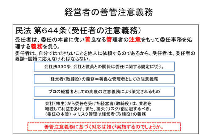続いて経営者に目を向けてみますと、経営者や取締役などの役員は、「業務を継続して利益を上げ、かつ損失を回避する」という役割を担っています。これは民法644条に定めがあり、644条では「受任者は、善良なる管理者の注意をもって委任事務を処理する義務を負う」と定められています。いわゆる善管注意義務と呼ばれるものです。経営者は株主から委任されている「受任者」であり、会社経営という「委任事務」を負っているのです。